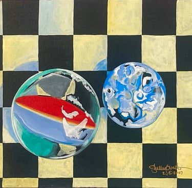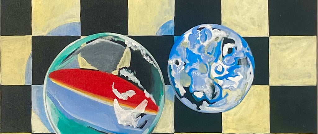 This painting is part of an ongoing exploration of playful structure, visual rhythm, and the small wonders hidden inside ordinary objects. Sometimes a marble is never just a marble.